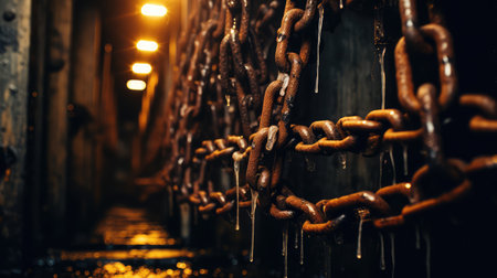 Rusty chains hang in dimly lit environment, showcasing their weathered texture and intricate links. atmosphere evokes sense of mystery and history, drawing attention to aged metal