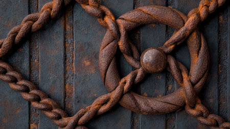 Rusty chain framing an old, weathered, corroded metallic background, creating a grunge, vintage, industrial aesthetic