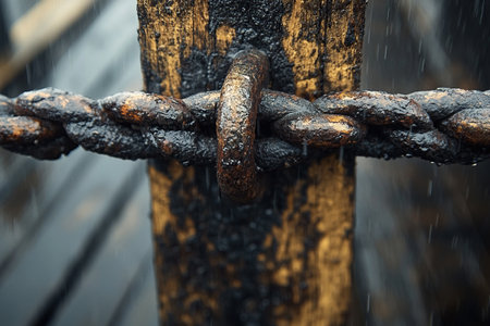 Close-up of metal chain and bracket on wooden post. The detailed texture of the wood and metal showcases an industrial and vintage aesthetic.