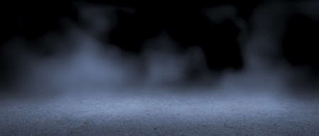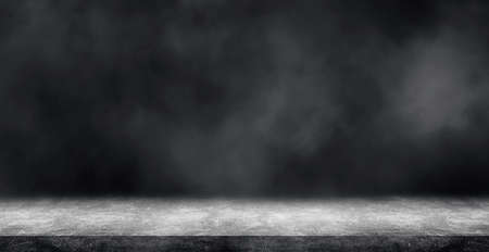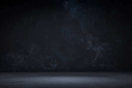 Empty space of Studio dark room with concrete floor grunge texture background and white smoke.