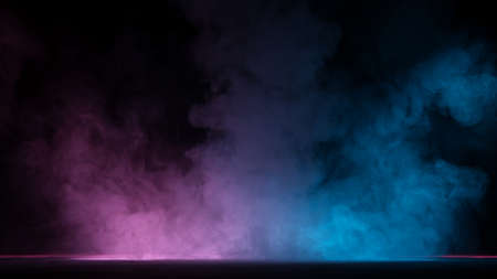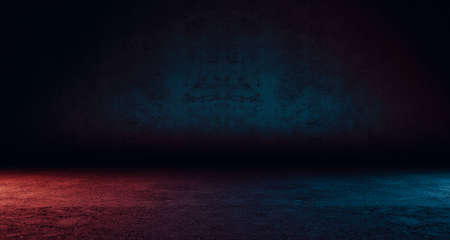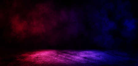 Empty space of Studio dark room with fog or mist and lighting effect red and blue on concrete floor grunge texture background.