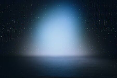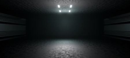 Plain Empty Dark Stage Underground Garage Hangar Cement Rough Concrete Floor Spotlights Glowing White Blue Modern 3D Rendering Illustration