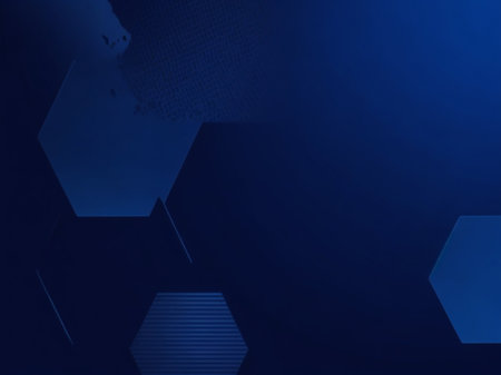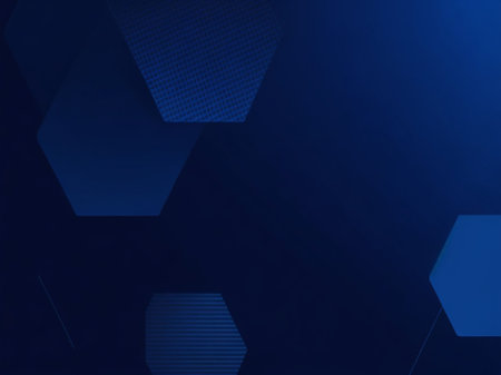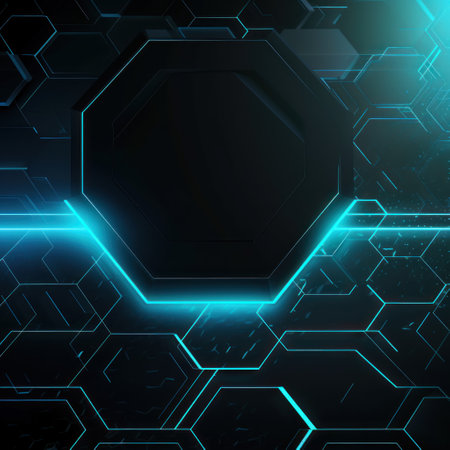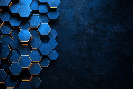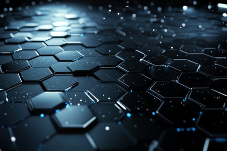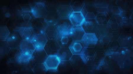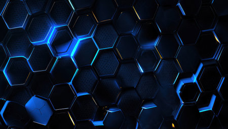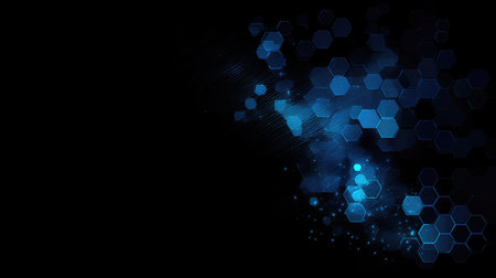 Futuristic geometric background with glowing blue hexagons on a black gradient. Generative AI