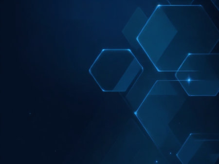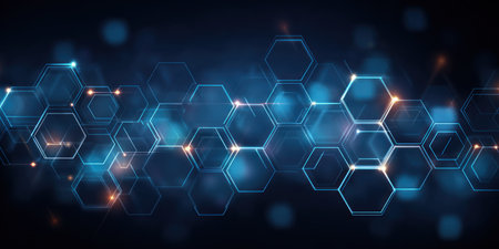Abstract technology background featuring a network of blue hexagonal shapes, with futuristic lines and digital elements, creating a high-tech concept