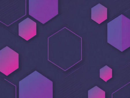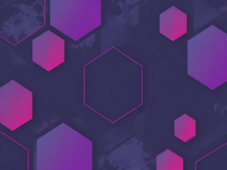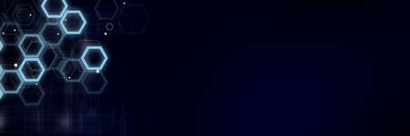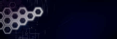 An abstract visual showcases a network of interconnected hexagonal shapes. The composition features a dark background, with the hexagons illuminated in shades of blue and purple. The design suggests a technological or scientific concept, potentially suitable for various applications in design, illustration, and digital media.