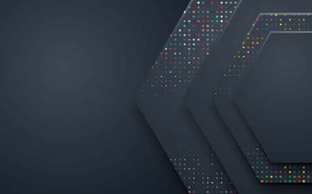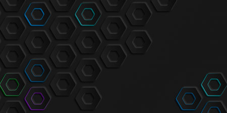 Neomorph black background with concave hexagons for cover design, banners, presentations, user interface design. Accent hexagons with colorful neon lights. neomorphism style. copy space