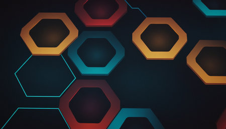 This image features an abstract network of interconnected hexagons, showcasing a technological theme. The composition uses a dark color palette with gradients and glowing highlights. This design could be used in various applications, including website backgrounds, presentations, or illustrations related to data and connectivity.