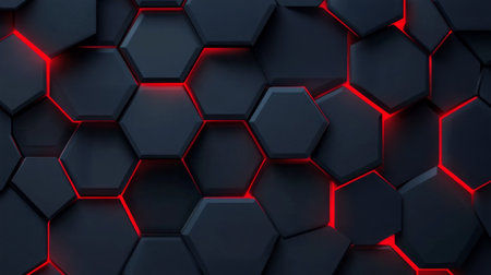 A striking abstract background featuring hexagonal shapes with a sleek black finish and vibrant red neon light accents, perfect for themes of technology and innovation.