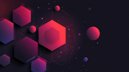 This abstract image features geometric shapes in vibrant colors against a dark backdrop. The design includes hexagons, spheres, and cosmic elements for a creative look.
