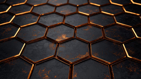 A mesmerizing arrangement of hexagonal tiles features glowing orange lines, creating an enchanting visual effect in a dimly lit space. The contrast adds depth and warmth to the composition.