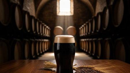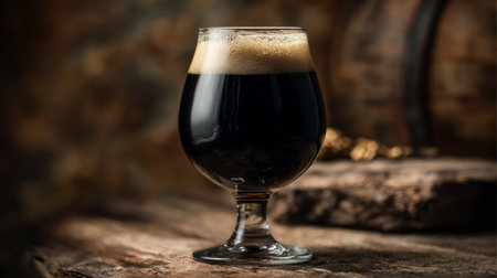 Dark stout beer fills a glass topped with creamy foam, elegantly placed on a rustic wooden barrel. The atmosphere is moody, enhancing the rich colors and textures.