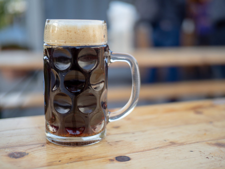 Refreshing pint of dark stout beer with thick creamy froth standing on wooden table in warm pub light
