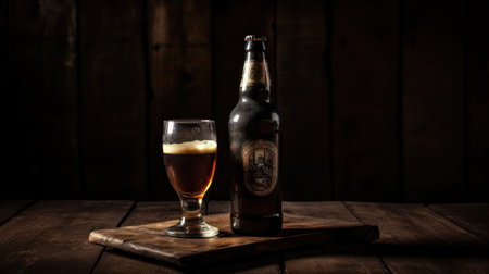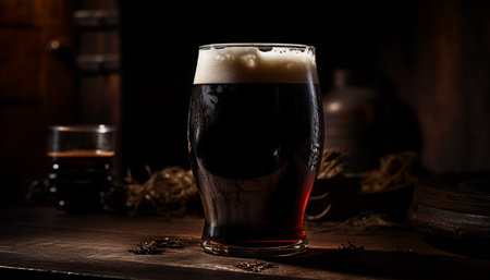Dark wood bar table, frothy whiskey stout in glass refreshment generated by artificial intelligence