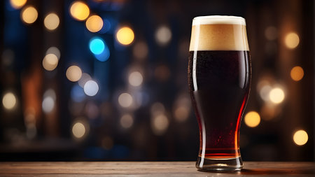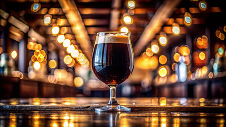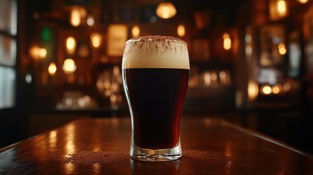 A refreshing dark beer sits in a glass, showcasing rich foam atop in a cozy bar atmosphere. Perfect for socializing and enjoying moments with friends.