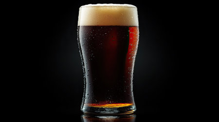 A beautifully captured dark beer glass with frothy foam and condensation, set against a striking black background. Perfect for bar or restaurant themes.