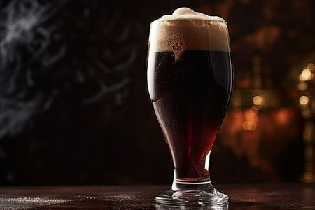 Dark beer glass with frothy head and steam on a warm orange background, perfect for cozy gatherings and celebrations