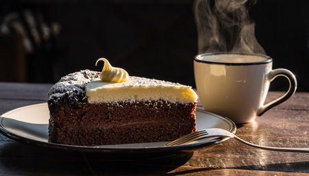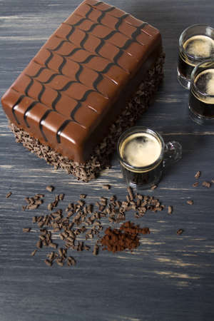 Chocolate cake with butter cream and cup of coffee on wooden table