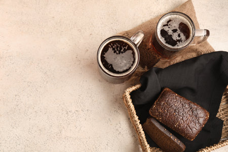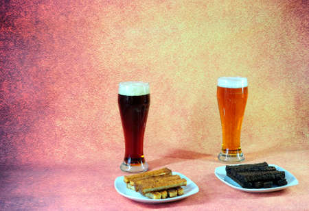 Two tall glasses with light and dark beer and two white ceramic plates with wheat and rye croutons, on a brown abstract background. Close-up.