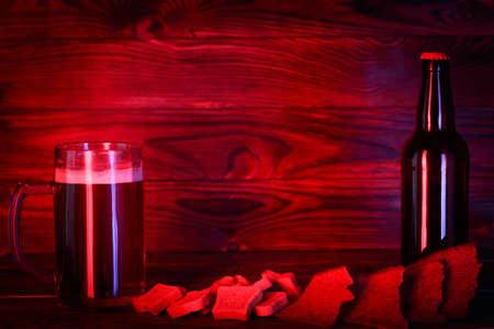 Dark beer in the glass and sun shining through the glass. Banner with copy space