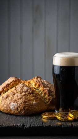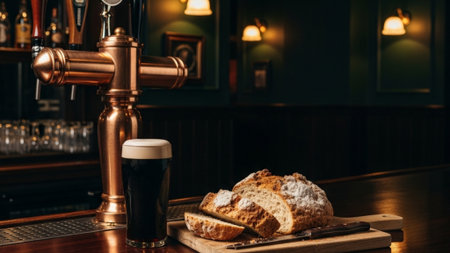 Pint of Irish stout beer with a perfect foam head and a plate of traditional Irish soda bread. Irish pub with St. Patrick's Day decor. Wide format banner. AI Generated