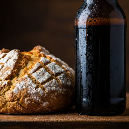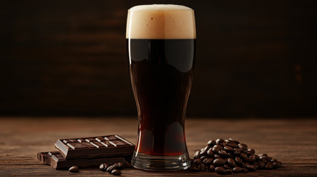 A captivating image of dark beer with a creamy frothy head, paired with rich chocolate and roasted coffee beans, set on a rustic wooden surface.