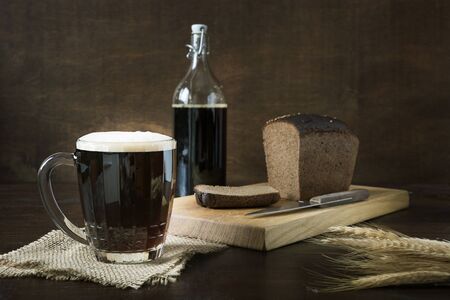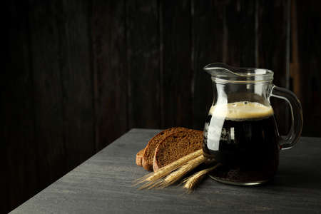 Russian beverage fermented kvass from rye bread in special half-liter mug on dark wooden background. Close up.
