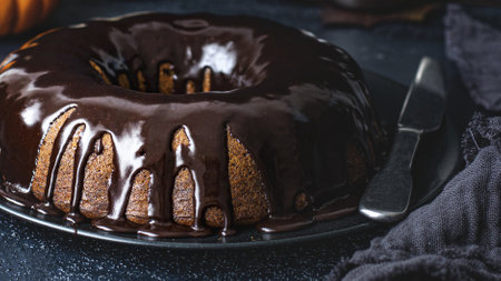 Chocolate bundt cake with chocolate glaze on a wooden background