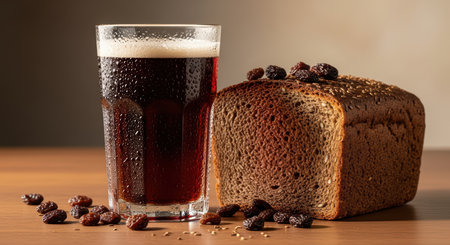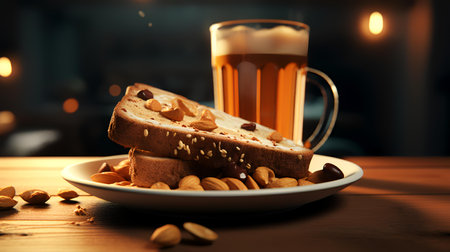 a photo of a dark bronze and dark black styled bread with marmalade on top, accompanied by a glass of beer. the surfaces are highly polished, streaked, and made of cheese. the composition exudes urban grittiness with a touch of mushroomcore. ai generated