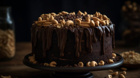 Pouring chocolate sauce onto delicious fresh cake Generative AI