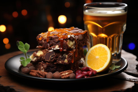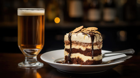 Chocolate cake, beer, dark background. Food pairing, dessert, bar