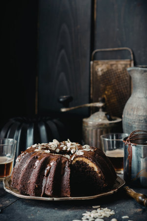 A richly decorated chocolate bundt cake with a glossy glaze and almond topping is displayed on a rustic table. The cake is surrounded by vintage kitchenware and a dark, moody background.