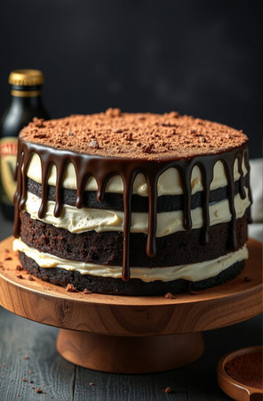 A beautifully crafted chocolate cake topped with creamy frosting, dusted with sugar, and set on a rustic wooden table, perfect for cozy gatherings.