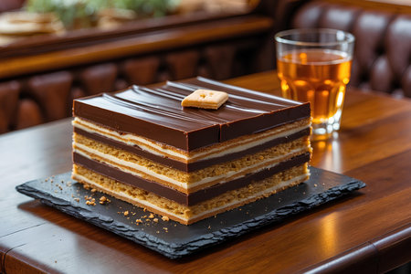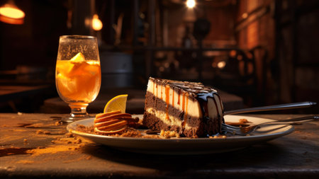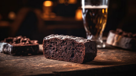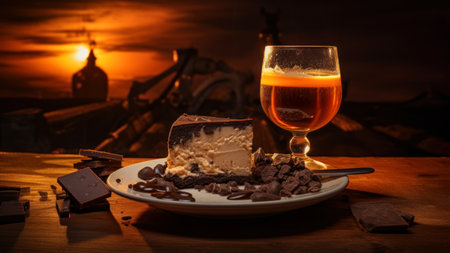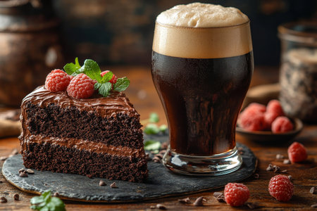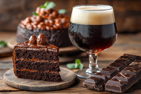 Chocolate cake, stout beer pairing, rustic setting, dessert