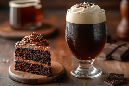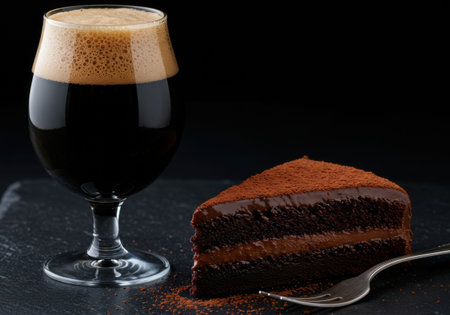 Stout beer glass with creamy foam and delicious chocolate cake slice. Sweet dessert and drink for Beer Day celebration.