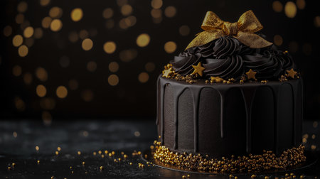 Luxury chocolate cake-cake decorated with a golden decor of caramelized popcorn on a dark background. Flat lay. Close-up. Copy space