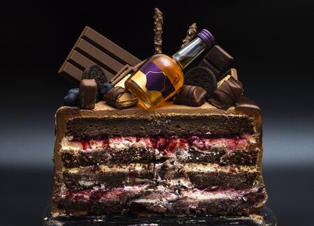 cake with various sweets, biscuits and blueberries with a small bottle of alcohol on top and drops of chocolate in a section, close-up