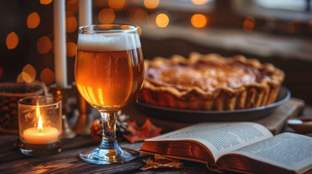 A cozy indoor setting featuring a glass of pumpkin beer next to a candle and a book, with a pumpkin pie in the background.