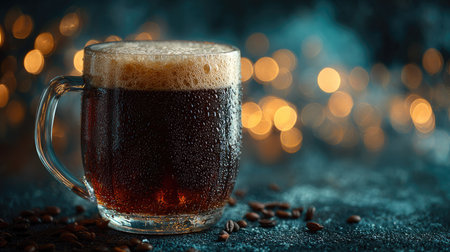 A beautifully crafted mug of dark beer, topped with frothy foam, sits invitingly against a backdrop of warm bokeh lights, perfect for celebrations.