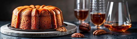 Gourmet Bundt Cake Drizzled with Glaze Served with Cognac in Crystal Glasses on a Dark Elegant Background AI Generative