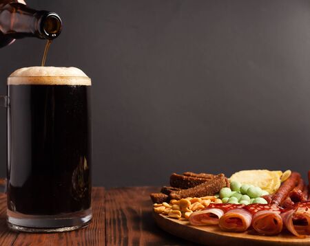 Mug of beer and assortment of snacks on a wooden table. Sausage, salami, ham, bacon. Beer salty snack, chips, wasabi nuts, salted peanuts, croutons.