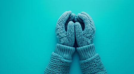 Close-up of knitted woolen gloves dusted with frost, evoking warmth and coziness in a chilly, snowy setting.