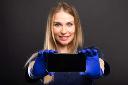 Doctor's hand in sterile medical gloves holding phone isolated on black background . Concept of protection against pandemic and viruses.