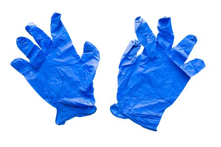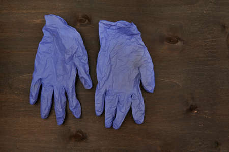Discarded lying on the floor blue disposable gloves medical. Coronavirus COVID-19 Infection control concept