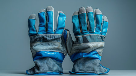 Blue work gloves on blue background represent personal protective equipment for grip, safety, and manual labor.
