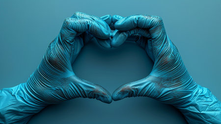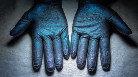 This artistic close-up features two gloved hands placed on a textured surface, illuminated by dramatic lighting, showcasing the importance of safety and professionalism.
