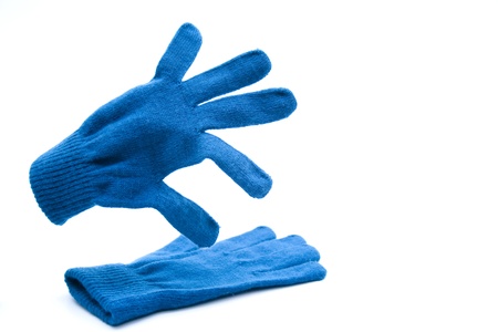 Pair of gloves isolated on the blue background. Dark blue mittens close-up with copy space.