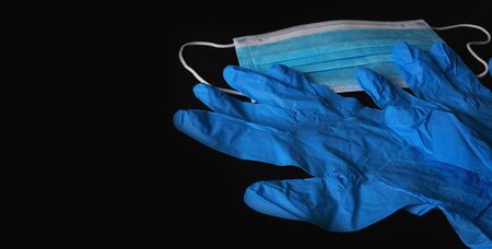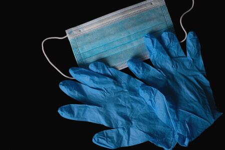 Blue medical sterile mask and blue sterile gloves isolated on a black