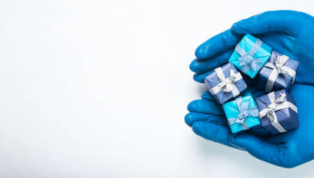 Hand in protective gloves holding small wrapped gifts over white background. Banner with copy space or place for text
