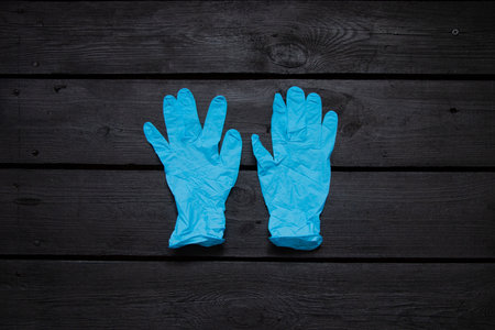 A pair of disposable medical gloves of blue color lies on a black board on the table