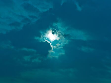 A dramatic and atmospheric of dark, moody clouds with a bright, ethereal moonlight breaking through. The deep blue tones create a sense of mystery and serenity.